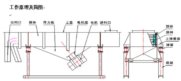 本篩機主要由篩箱、篩框、篩網(wǎng)、振動電機、電機臺座、減振彈簧、支架組成。